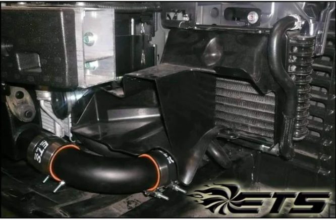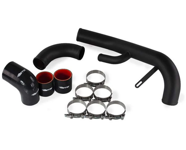 From the intercooler outlet the 2.5" mandrel bent piping continues around the core support, with only two gradual radius bends in its entire length, to the lower intercooler pipe bracket before making a straight shot to the throttle body. ETS 4-ply silicone and 100% SS T-bolt clamps are included for every connection to ensure that blown off intercooler piping stays a thing of the past!